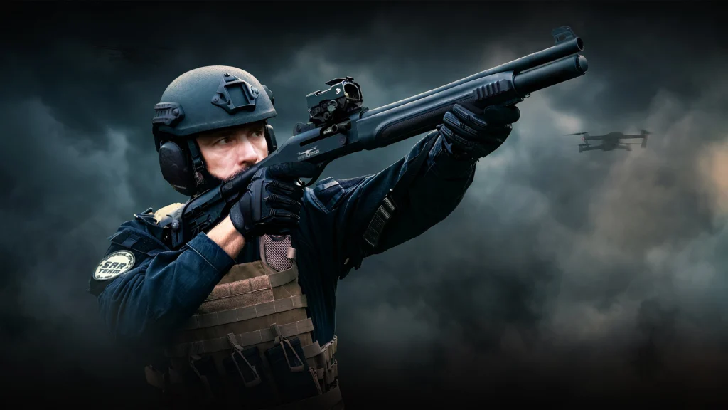 SAR Drone Killer: Developed against unmanned aerial vehicles, this 12-gauge system offers an effective solution to drone threats with its 7+1 round capacity and recoil-dampening mechanism.