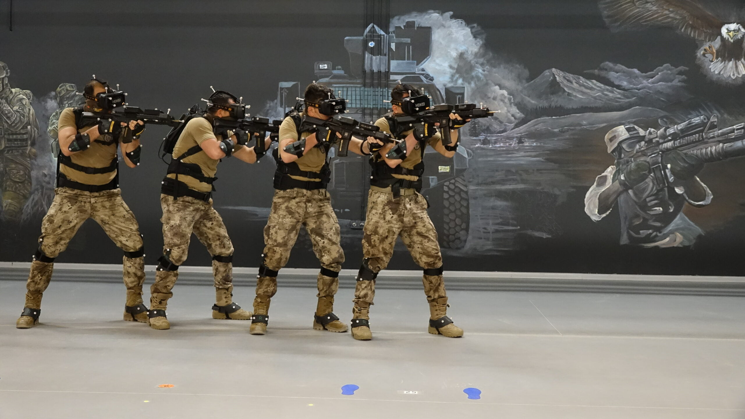 Üzerlerinde özel işaretler, sırt bilgisayarı ve sanal gerçeklik gözlüğü bulunuyor.