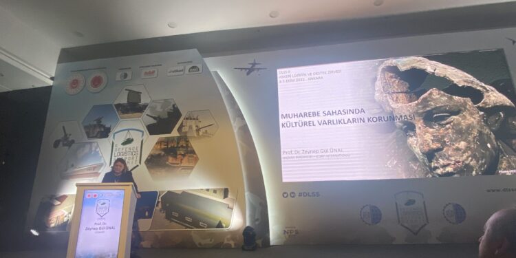 Prof. Dr. Zeynep Gül Ünal, Askeri Lojistik ve Destek Zirvesi’nin ikinci gününde “Muharebe Sırasında Kültürel Varlıkların Korunması” başlıklı sunumuyla katılımcılara kültürel varlıkların öneminden ve korunmasına ilişkin çalışmalardan bahsetti.