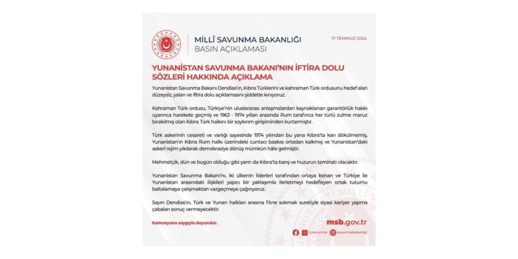 T.C. Millî Savunma Bakanlığı (MSB), Yunanistan Savunma Bakanı Nikos Dendias’ın, Kıbrıs Türklerini ve Türk ordusunu hedef alan açıklamasının şiddetle kınandığını bildirdi.
