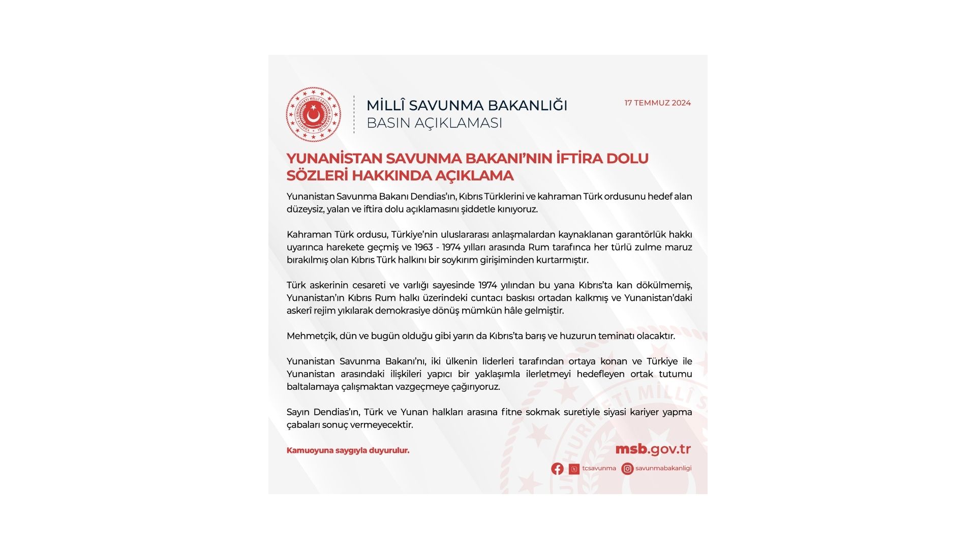 “Türk askerinin cesareti ve varlığı sayesinde 1974 yılından bu yana Kıbrıs’ta kan dökülmemiş, Yunanistan’ın Kıbrıs Rum halkı üzerindeki cuntacı baskısı ortadan kalkmış ve Yunanistan’daki askeri rejim yıkılarak demokrasiye dönüş mümkün hale gelmiştir. Mehmetçik, dün ve bugün olduğu gibi yarın da Kıbrıs’ta barış ve huzurun teminatı olacaktır. Yunanistan Savunma Bakanı’nı, iki ülkenin liderleri tarafından ortaya konan ve Türkiye ile Yunanistan arasındaki ilişkileri yapıcı bir yaklaşımla ilerletmeyi hedefleyen ortak tutumu baltalamaya çalışmaktan vazgeçmeye çağırıyoruz. Sayın Dendias’ın, Türk ve Yunan halkları arasına fitne sokmak suretiyle siyasi kariyer yapma çabaları sonuç vermeyecektir.” ifadeleri yer aldı. (Kaynak AA)