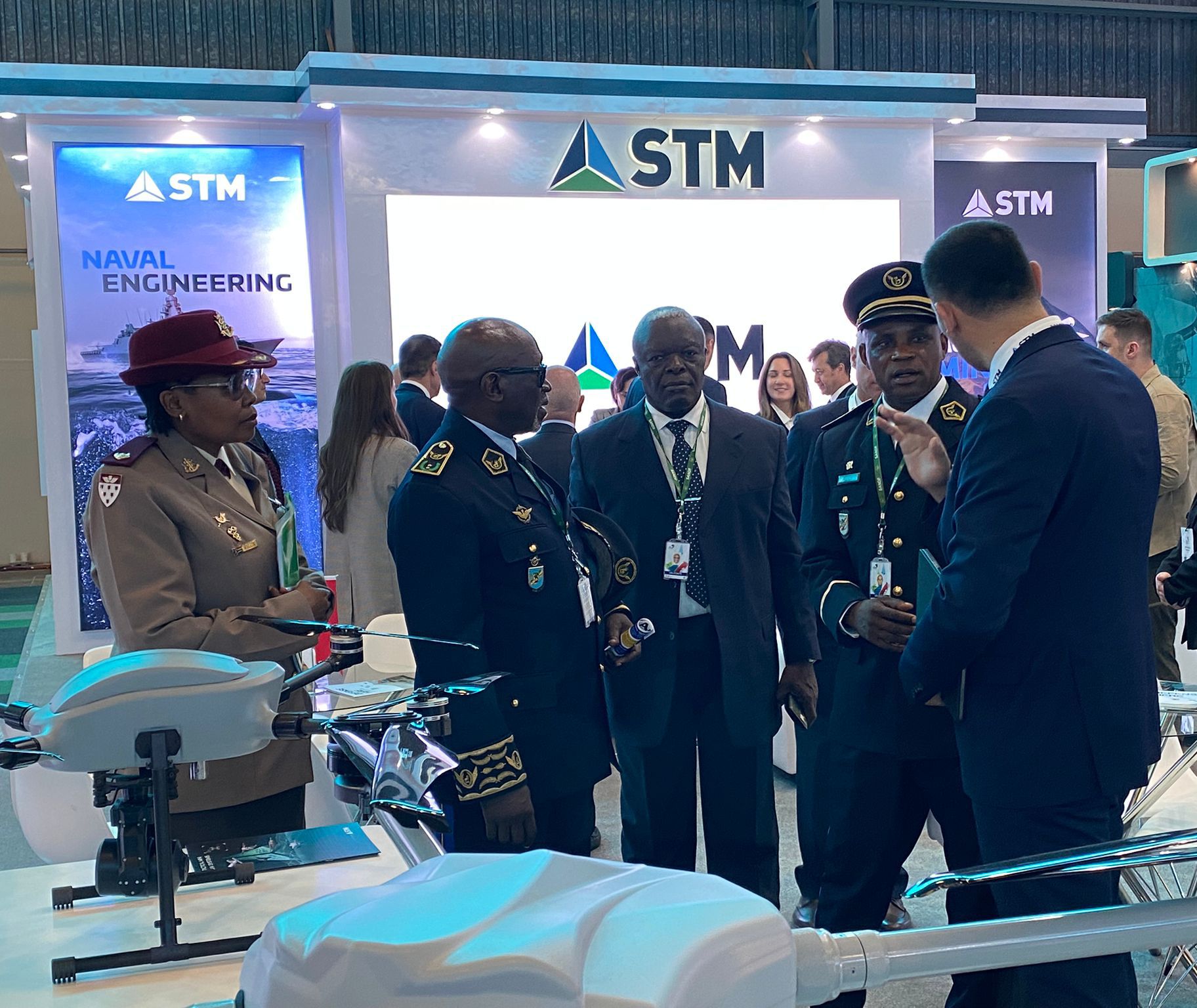 Güney Afrika Devlet Başkanı Cyril Ramaphosa başta olmak üzere çok sayıda üst düzey heyeti standında ağırlayan STM, askeri denizcilik projeleri ve taktik mini İHA sistemleri hakkında katılımcılara bilgi verdi.