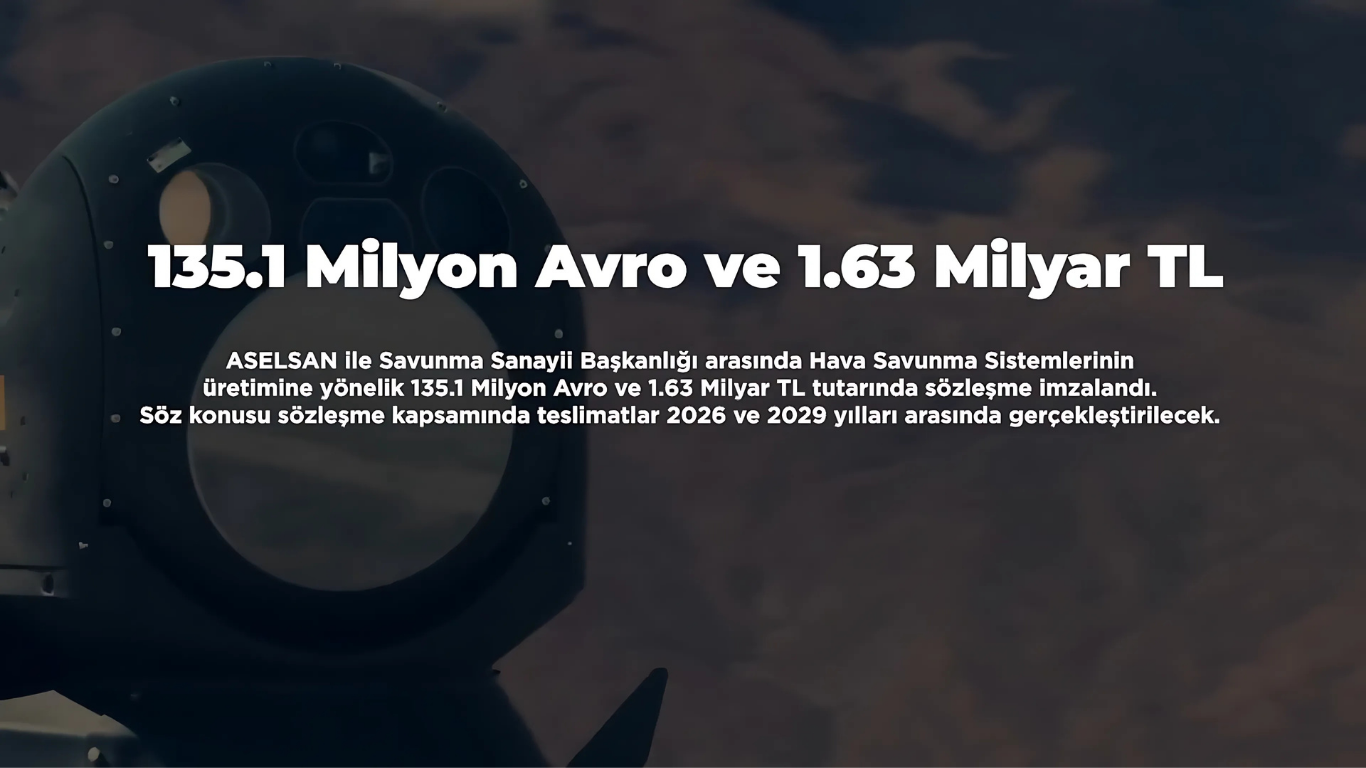 “ASELSAN ile Türkiye Cumhuriyeti Savunma Sanayii Başkanlığı arasında hava savunma sistemlerinin üretimine yönelik 135 milyon 106 bin 533,65 avro ve 1 milyar 635 milyon 406 bin 909,73 lira tutarında sözleşme imzalanmıştır. Söz konusu sözleşme kapsamında teslimatlar 2026 ve 2029 yılları arasında gerçekleştirilecektir.” ifadesi kullanıldı.