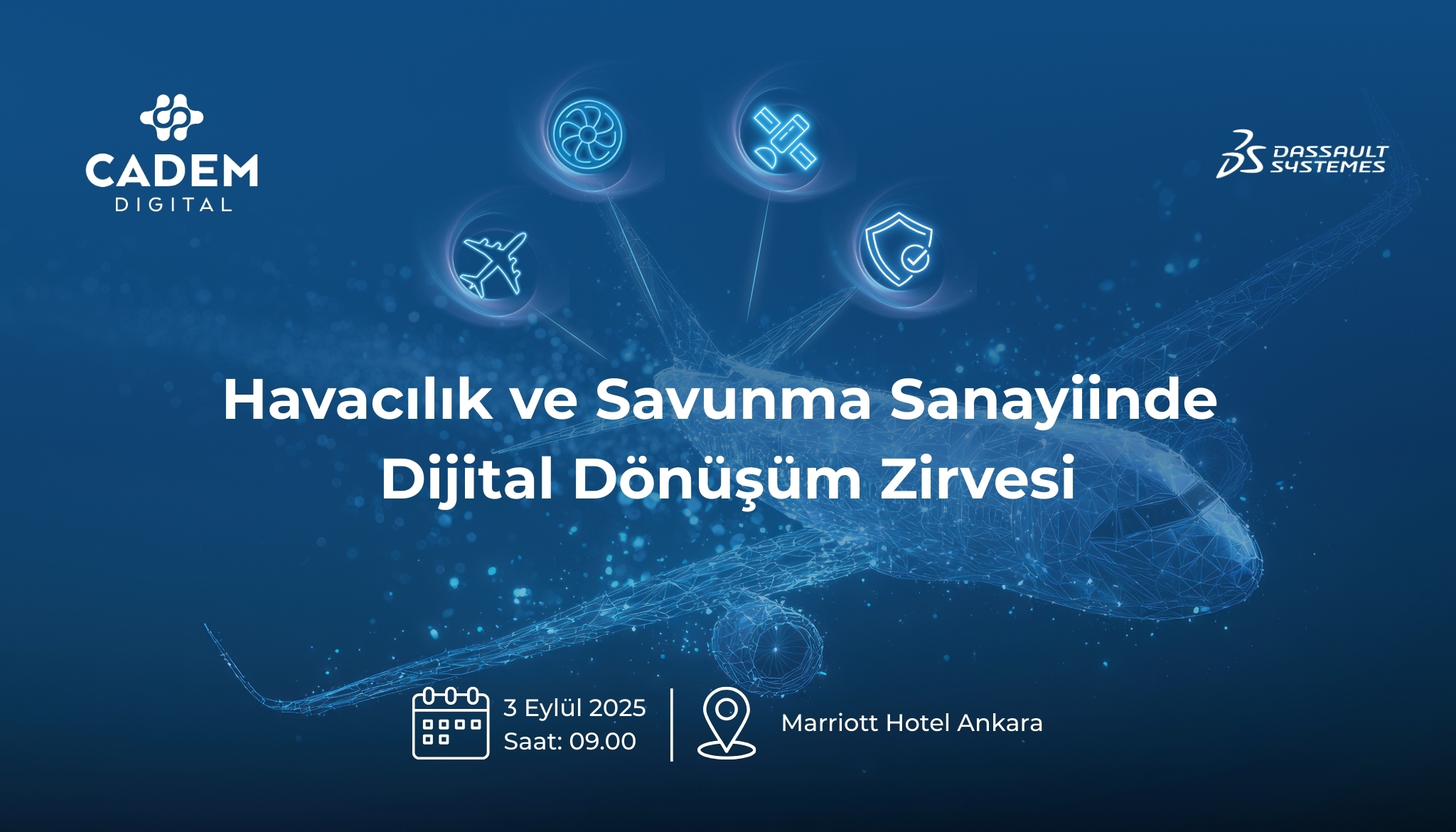 Cadem Digital ve Dassault Systèmes iş birliğiyle düzenlenen “Havacılık ve Savunma Sanayiinde Dijital Dönüşüm Zirvesi 2025”, sektörün geleceğini şekillendirecek en yeni teknolojileri katılımcılarla buluşturmak üzere 3 Eylül 2025 tarihinde Ankara JW Marriott Hotel’de gerçekleştirilecek.