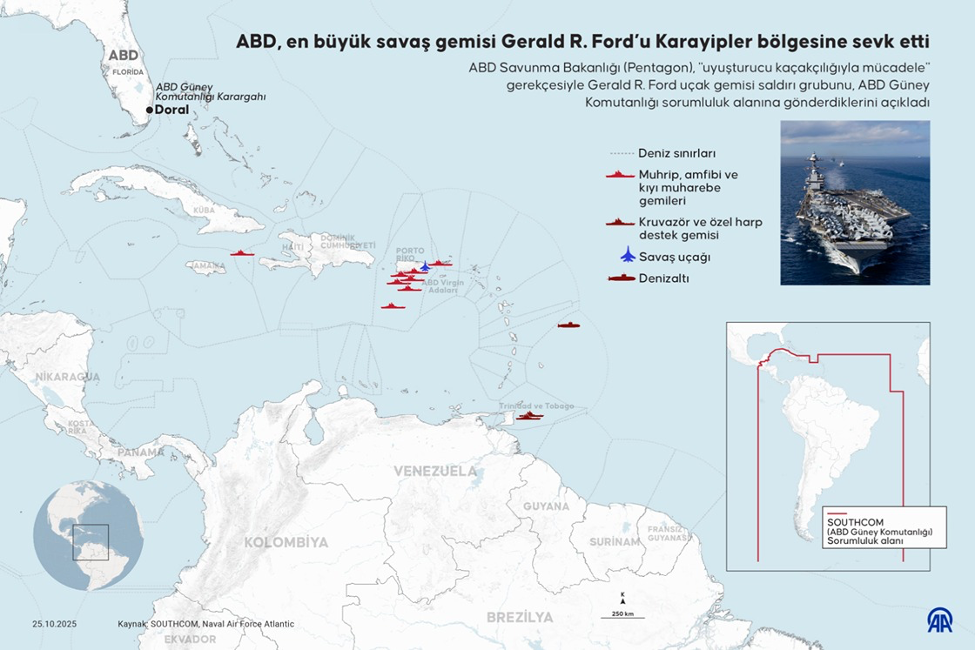 ABD Savunma Bakanlığı (Pentagon), “uyuşturucu kaçakçılığıyla mücadele” gerekçesiyle Gerald R. Ford uçak gemisi saldırı grubunu, ABD Güney Komutanlığı sorumluluk alanına gönderdiklerini açıklamıştır. [70].