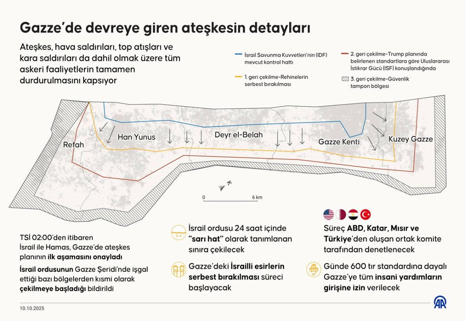 ABD Dışişleri Bakanı Marco Rubio, İsrail Parlamentosu’nda (Knesset) Batı Şeria’ya İsrail hukukunun uygulanmasına yönelik yasa tasarısının ön onay almasının ardından yaptığı açıklamada, bu hamlenin “Gazze’deki barış planını tehlikeye atabileceğini” söyledi.[31]İsrail basınına göre ise, İsrail uzun süre Türkiye’nin Gazze’de rol almasını istemedi ve buna şiddetle karşı çıktı. Ancak Trump’ın baskıları ve Türkiye-ABD ilişkilerinin son dönemde geldiği yakınlıktan dolayı, Trump Erdoğan’a güvenerek Orta Doğu’da ‘düzen sağlamasını’ bekliyor. Türkiye’nin Hamas üzerinde baskı kurma yeteneği anlaşmanın imzalanmasını sağlamıştır. [32]Cumhurbaşkanı Erdoğan, : “Gazze’de akan kanın durması ve ateşkesin sağlanması için ABD Başkanı Sayın Trump’ın gösterdiği çabayı ve liderliği takdir ediyorum. Tarafların kabul edeceği adil ve kalıcı bir barışın tesis edilmesi için Türkiye olarak biz de sürece katkı vermeye devam edeceğiz.”demiştir. [33]Cumhurbaşkanı Recep Tayyip Erdoğan, 15 Ekim 2025’te gerçekleştirilen kabine toplantısının ardından yaptığı açıklamalarda, bağımsız bir Filistin devleti kurulana kadar mücadelelerinin hız kesmeyeceğini dile getirdi. Erdoğan, Gazze’de ateşkesin yürürlüğe girmesinden memnuniyet duyduğunu ifade ederken, Türkiye’nin insani yardımların girişine ağırlık vereceğini belirmiştir. [34]