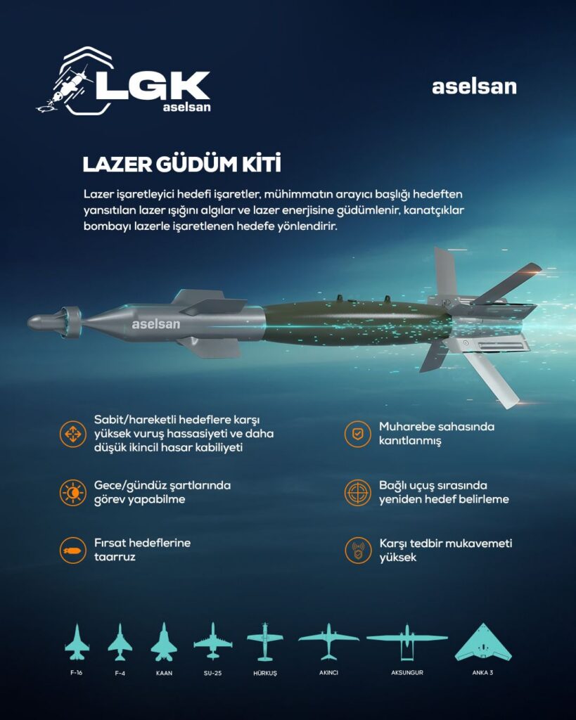 LGK, operasyonel esnekliği sayesinde modern ve milli platformlar dahil olmak üzere geniş bir hava aracı ailesine entegre edilebiliyor. Kitin kullanılabildiği platformlar arasında; F-16, F-4, KAAN, SU-25, HÜRKUŞ, AKINCI, AKSUNGUR ve ANKA-3 gibi TSK envanterinin temel unsurları bulunuyor. Bu geniş entegrasyon, LGK’yı Türkiye’nin mühimmat çözümlerinde çok yönlü bir standart haline getiriyor.