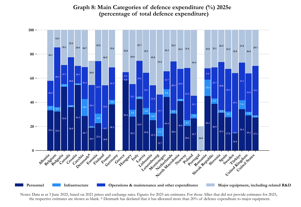 Ülkesel askeri harcamalara ek olarak, müttefik ihtiyaçlarının getirdiği ortak harcamalar genelde gözlerden uzak kalır. NATO’nun yıllık genel giderleri 2025 yılında yaklaşık 4,6 milyar Avro olup, önümüzdeki yıl için 5,3 milyar Avro planlanmaktadır. Genel Sekreter’in kullanımındaki sivil mali bütçe 2025 yılında 483,3 milyon Avro olarak öngörülmüştür. Bu sivil bütçe genelde Dışişleri Bakanlıklarından aktarılır; Brüksel’deki merkezde veya diğer ülkelerdeki uluslararası düzeyde sürekli çalışan sivil ve üniformalı personelin maaşları, idame işleri, eğitimler, diplomatik faaliyetler ve Genel Sekretarya’nın çeşitli ortak projeleri gibi ihtiyaçları karşılar.