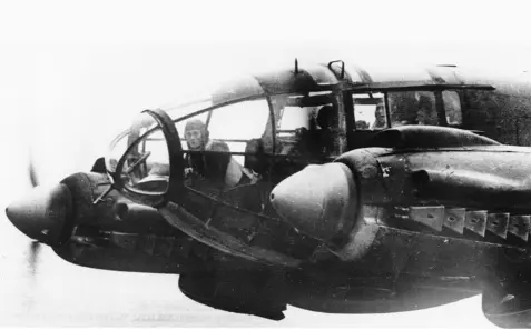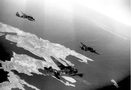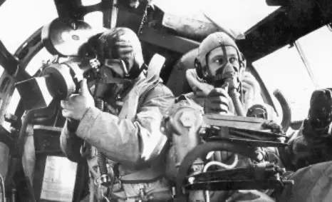 1940 yılının Kasım ayında İngiltere üzerinde Alman Heinkel He 111 bombardıman uçağının burnundaki makinalı tüfekçi savaş pozisyonunda, sağda pilot ve istihbarat subayı