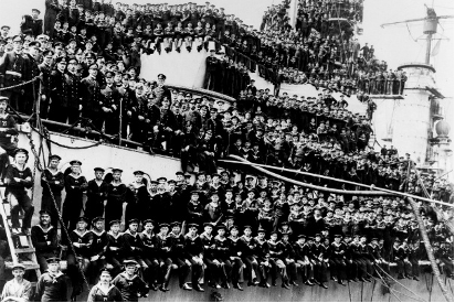 Muharebe öncesi askerler ve İngiliz Donanmasında: HMS Tiger gemisinden HMS Plassy gemisine binen yaralı askerler.[28]