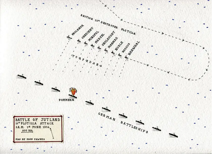 Jutland Muharebesi sırasında, 1 Haziran 1916 şafak vakti İngiliz 12. Muhrip Filosunun Alman Savaş Hattına yaptığı saldırıyı gösteren plan. Saldırıda, Alman ön-dretnot SMS Pommern tüm mürettebatıyla birlikte batırıldı. Alman savaş gemilerinin sırası belirsizdi, çünkü gemiler torpidolardan kaçınmak için gece boyunca hat dışına çıkmak zorunda kalmış ve daha sonra boşluk olan yere yeniden girmişlerdi.
