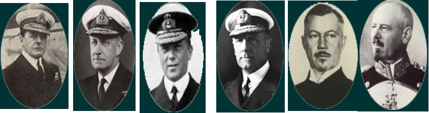 Amiral Beatty (savaş görevlisi), Tuğamiral Arbuthnot (1. Dreadnought Sqn), Tuğamiral Hood (2.), büyük Amiral Jellicoe (Büyük filo), Amiral Scheer (Savaş Gemileri), Amiral Hipper (Savaş Kruvazörleri).