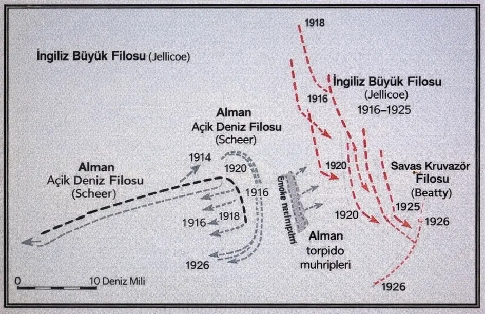 Almanlar ise, bir savaş kruvazörü ve bir savaş gemisi de dahil olmak üzere toplam 62.000 tonluk on bir gemi kaybetmiş ve 2.500 mürettebat öldürülmüştü. Savaş, iki filonun göreceli güçlerini pek değiştirmediği için hiçbir taraf zafer kazanamamıştı. Savaş böylece beş ayrı bölüme ayrıldı. İlki, Beatty’nin Scheer’in kuvvetlerini güneye doğru takip ettiği savaş kruvazörü çatışmasıydı. Bunu, Hipper’in ana savaş filosuyla karşılaşmanın ardından Beatty’nin kuzeye doğru yaptığı atılım izledi. Bunun iki amacı vardı: Savaş kruvazörlerini korumak ve aynı zamanda Açık Deniz Filosunu Jellicoe’nun menziline çekmek. İki ana savaş filosu arasındaki karşılaşma gerçekten de iki kısa, yıkıcı, ancak esasen sonuçsuz çatışmada gerçekleşti. İki savaş hattı ayrıldıktan sonra, daha hafif gemiler arasında karışık bir dizi gece çatışması kaldı ve bu sırada Hipper’in kuvvetleri kendi limanlarına kaçtı.