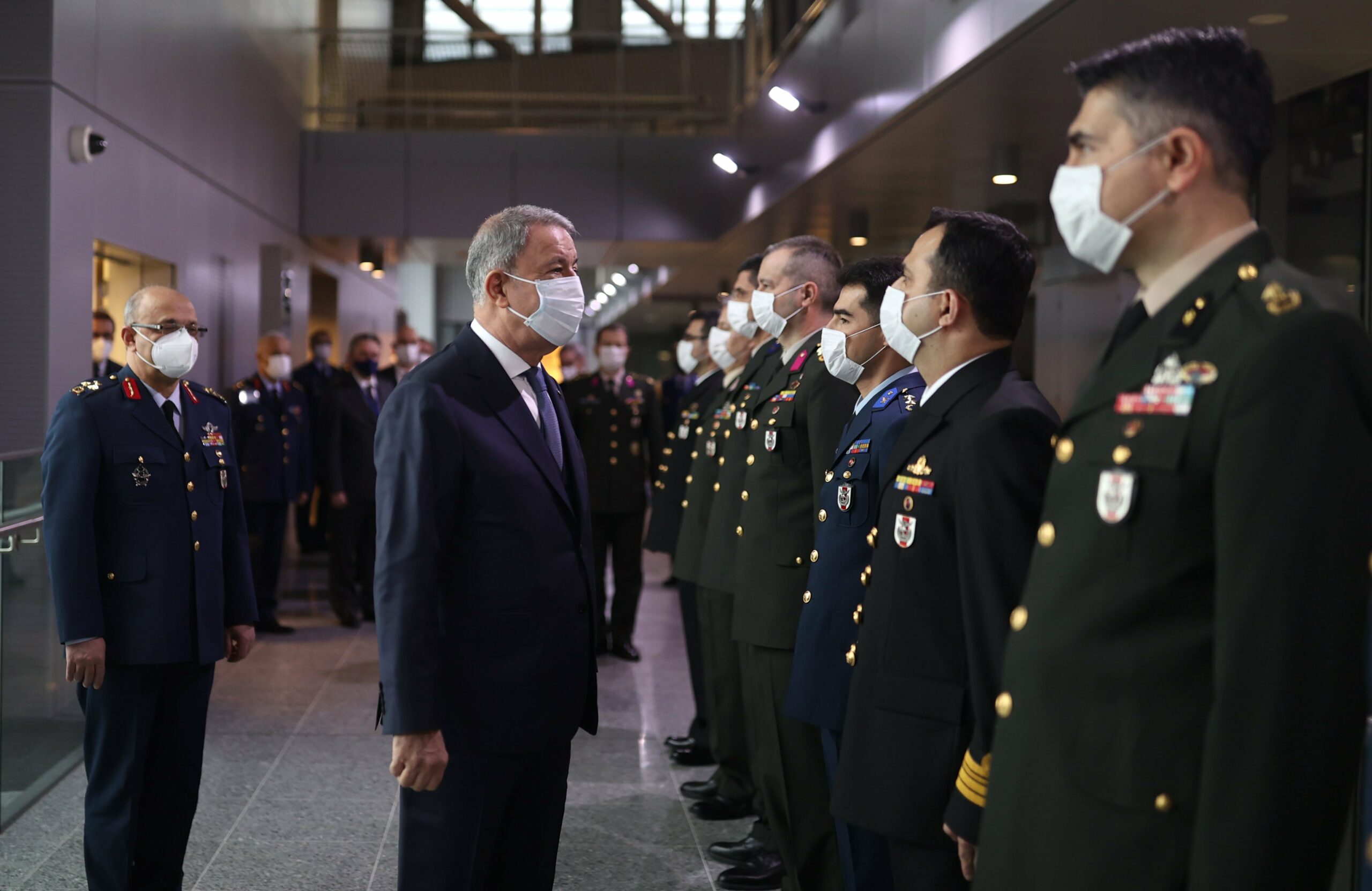 Türkiye’nin NATO Daimi Temsilcisi Büyükelçi Basat Öztürk ve diğer yetkililer tarafından karşılanan Akar, NATO Daimi Temsilciliği ile Türk Askerî Temsilciliğini ziyaret etti.